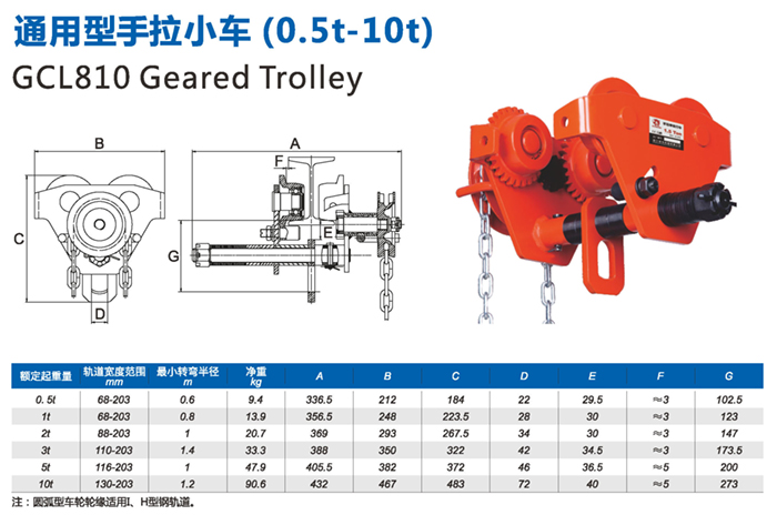 常規(guī)型手推小車(chē) GCL/GCT810系列小車(chē)選用了全新的高強(qiáng)度低合金結(jié)構(gòu)鋼,確保4倍安全載荷,輕巧、安全、安裝方便、是目前最為輕巧小車(chē)之一。 1.采用優(yōu)質(zhì)鋼材,結(jié)構(gòu)緊湊,外型美觀。 2.國(guó)際標(biāo)準(zhǔn)生產(chǎn),安全性能可靠。 3.可多種選擇,“H”型鋼、“I”型鋼均可適用。