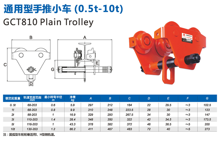 常規型手推小車 GCL/GCT810系列小車選用了全新的高強度低合金結構鋼,確保4倍安全載荷,輕巧、安全、安裝方便、是目前最為輕巧小車之一。 1.采用優質鋼材,結構緊湊,外型美觀。 2.國際標準生產,安全性能可靠。 3.可多種選擇,“H”型鋼、“I”型鋼均可適用。